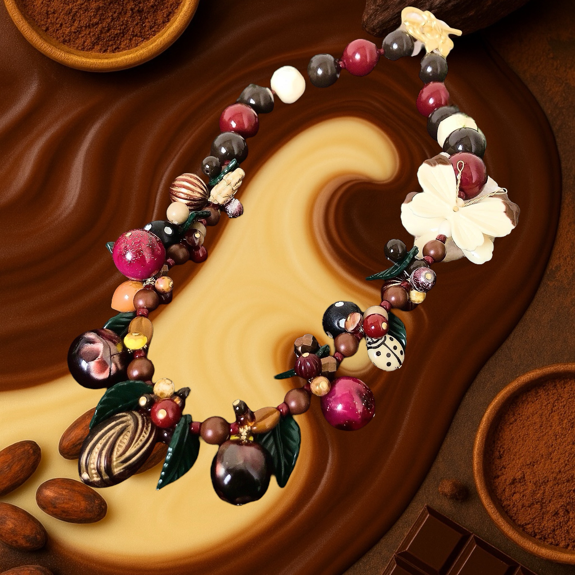 珍しく落ち着いた色味で仕立てた「チョコレートの森」ネックレス。